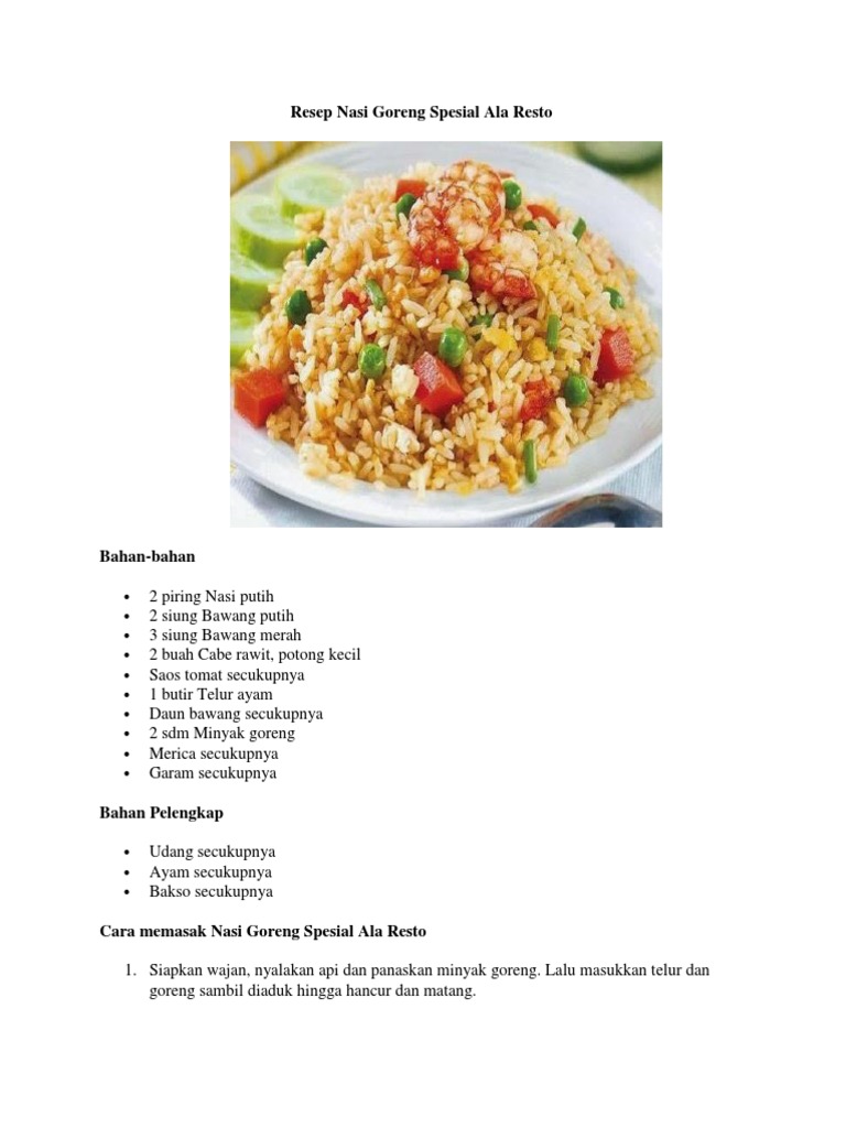 Resep nasi goreng spesial restoran. Check spelling or type a new query. We did not find results for: Maybe you would like to learn more about one of these?